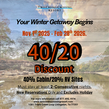40% OFF CABINS - 20% OFF RV SITES - NEW RESERVATIONS - *excludes holidays